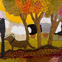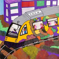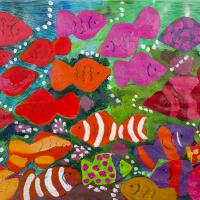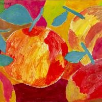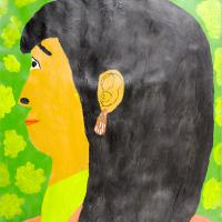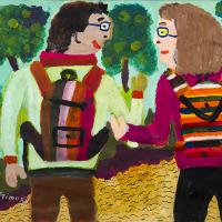 elkaar gebruikt in een kunstwerk. Met stift wordt voor de detaillering ook over acrylverf getekend.